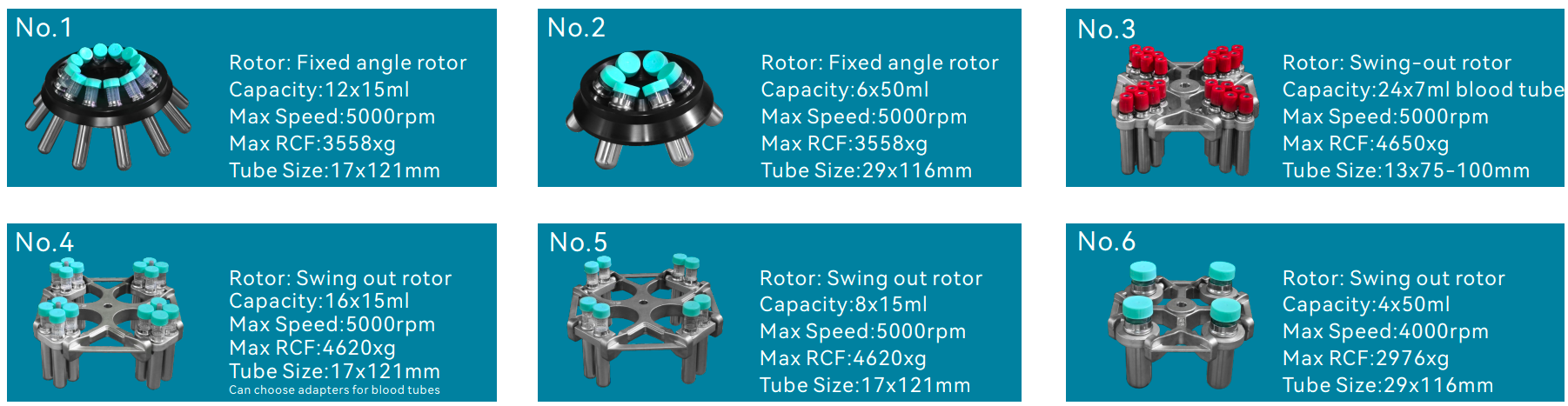 Rotors: Choice of aluminum alloy fixed-angle rotors or stainless steel swing-out rotors.